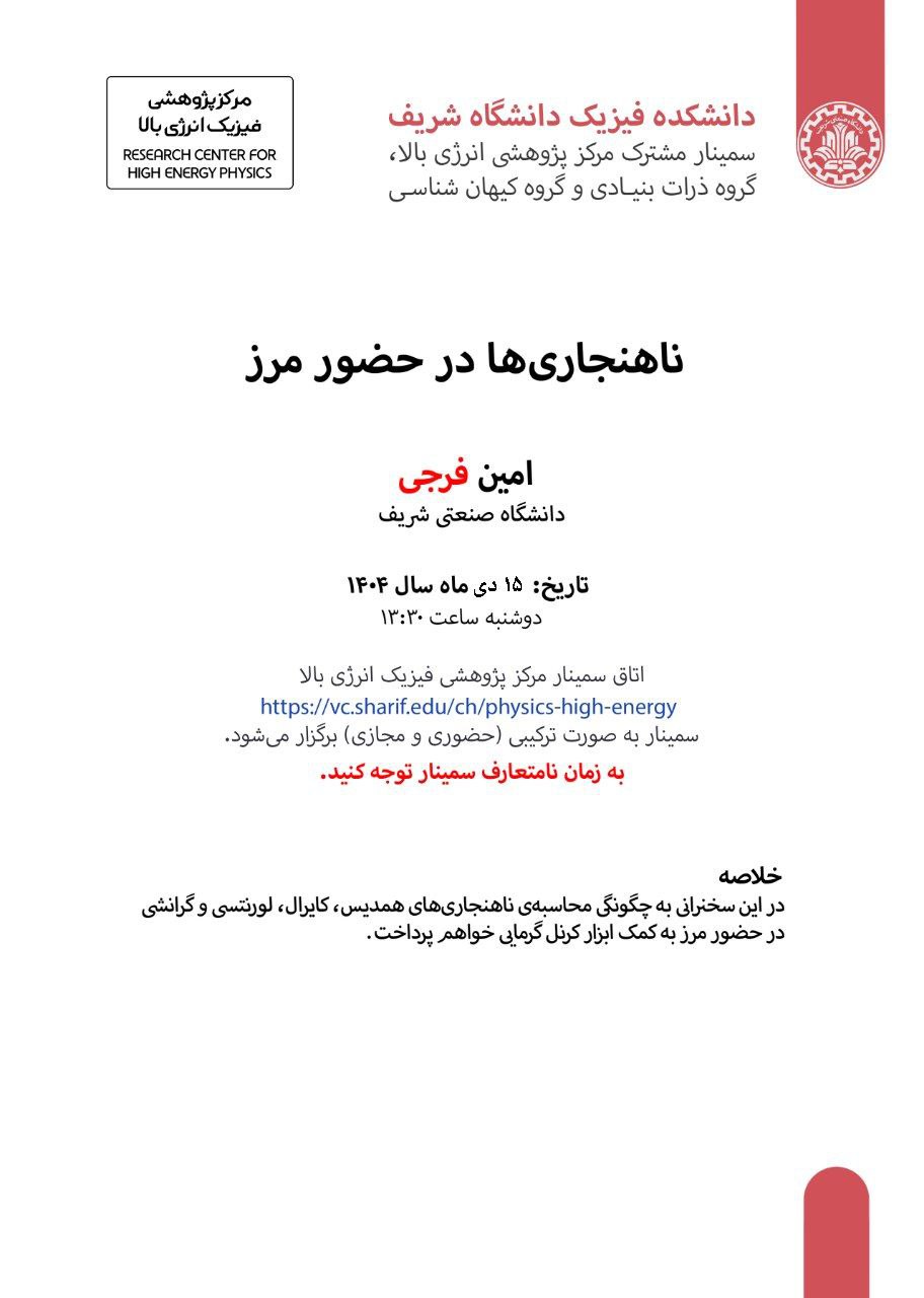 سمینارهای هفتگی مرکز پژوهشی فیزیک انرژی بالا ناهنجاریها در حضور مرز سخنران: امین فرجی دانشگاه...