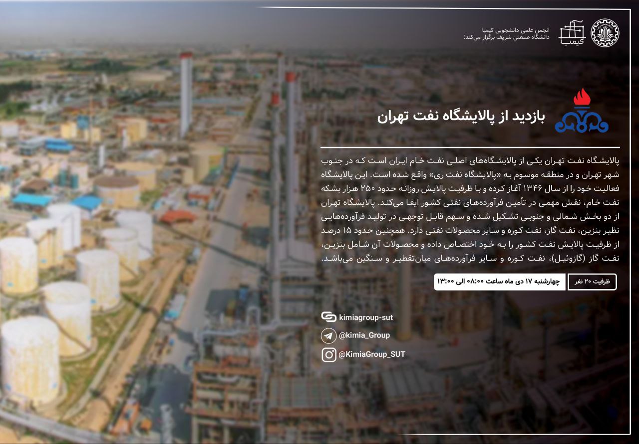 📢انجمن علمی دانشجویی کیمیا دانشگاه صنعتی شریف برگزار میکند: ⬅️ بازدید از پالایشگاه نفت تهران 📅...