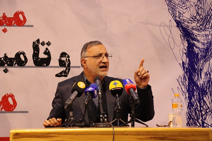 شهردار تهران در خاتمه با اشاره به جنگ علیه ایران گفت: در جنگ ما با ۴۳ کشور درگیر شدیم. این موضوع بر طبق اسناد است که ۴۳ کشور با پول و سلاحشان به میدان آمده بودند و در مقابل اعتقاد ما شکست خوردند. نباید با افتخارات ملی خود بد برخورد کنیم. بیتردید ترور هنر نیست وقتی صحبت از امنیت میکنید سوریه، لبنان، افغانستان، عراق و ... را ببینید و این در شرایطی است که بدون ارادهی ما در خلیج فارس نمیتوانند کاری بکنند و با ما به فارسی صحبت میکنند.