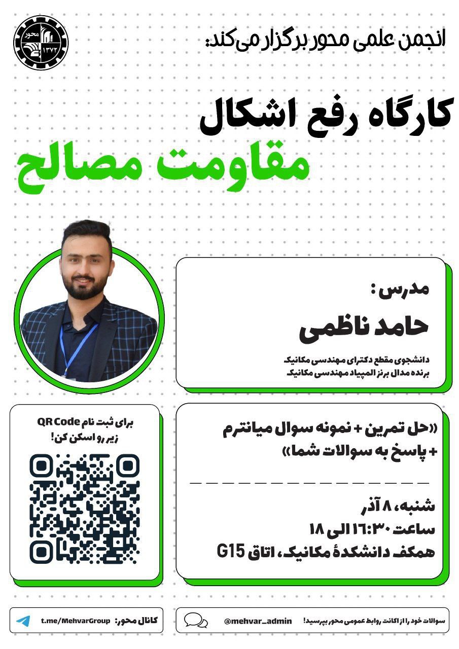 ⚜ انجمن علمی محور برگزار میکند: «کارگاه رفع اشکال مقاومت مصالح» 👤 ارائهدهنده: حامد ناظمی 🔹...